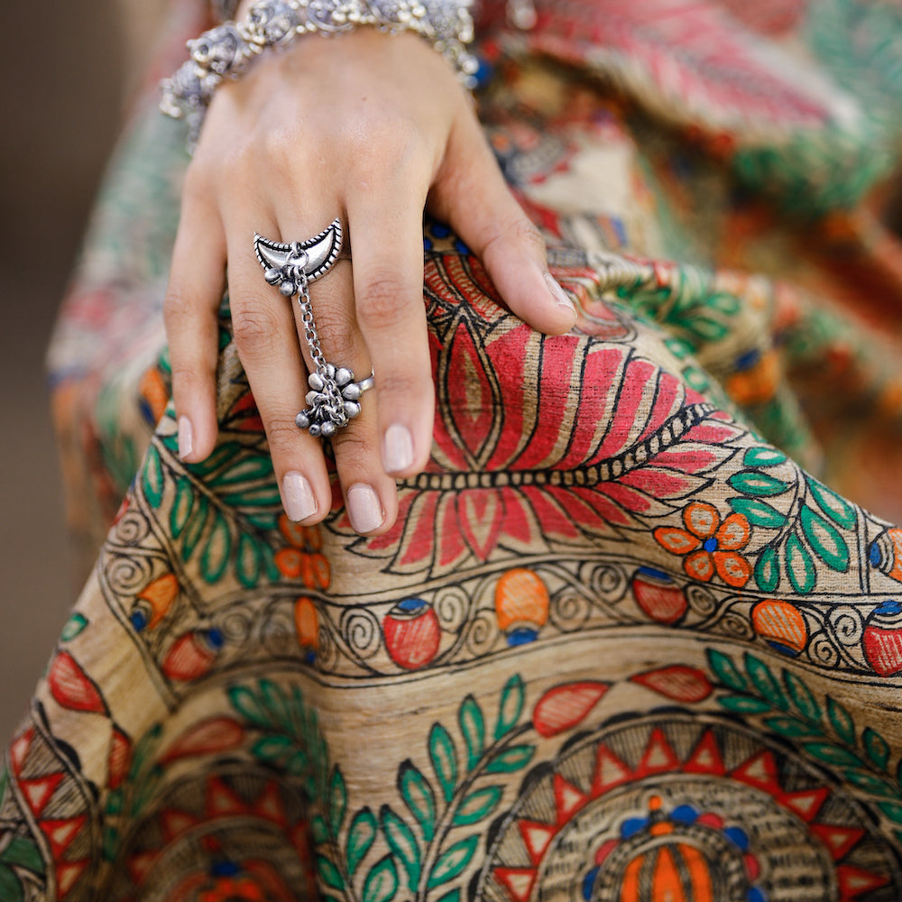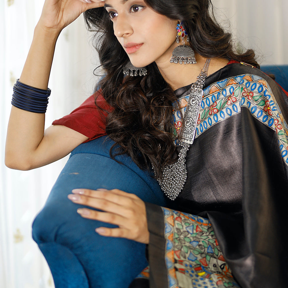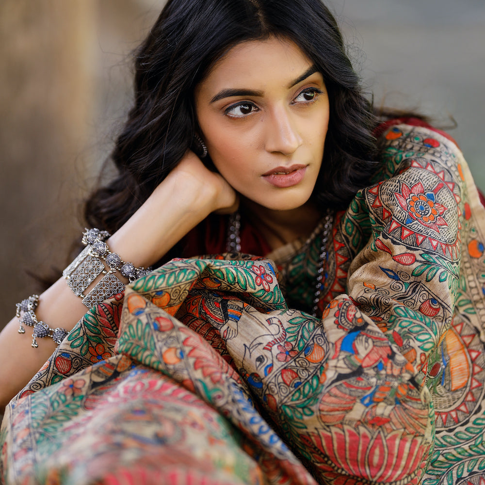 Madhubani Hand-Painted Matasya Tussar Silk Saree -