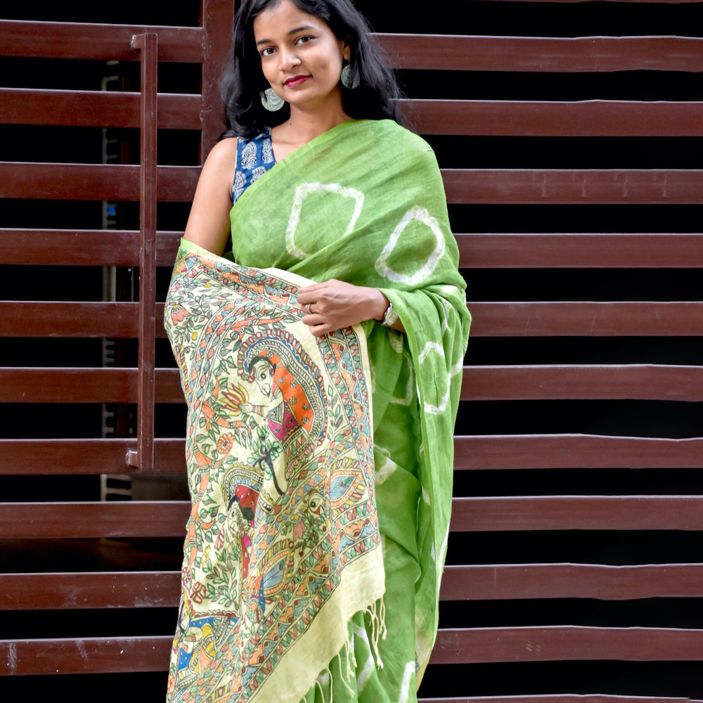 Madhubani Shibori Hand-Painted Linen Saree -