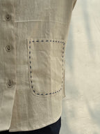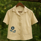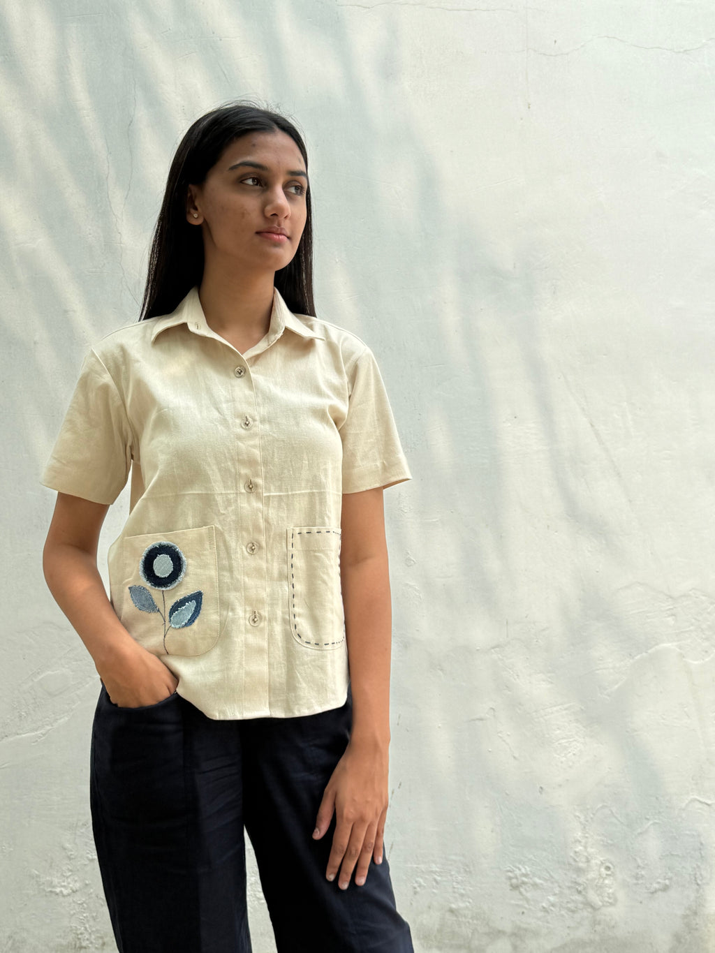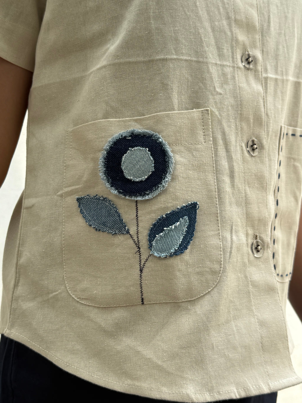 The Cornflower Shirt is a structured yet playful take on everyday shirting. Made from a soft cotton-linen blend, it features a boxy fit with short sleeves, a wide collar, and two patch pockets — one of which is detailed with a charming blue floral embroidery that adds a pop of color and personality. The contrast stitch around the second pocket balances utility with thoughtful design. It's breathable, easy to layer, and versatile enough to dress up or down.