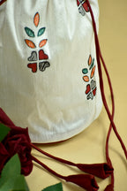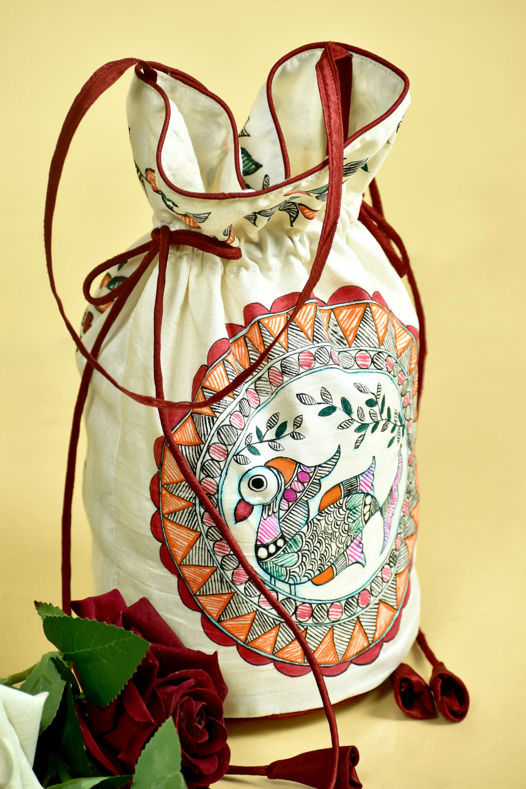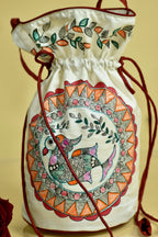 Adorned with beautiful hand-painted multicolor madhubani and contrast piping that add to its charm, our Silk potli is handcrafted, unique and intricate.This ethnic potli is perfect to go along with your traditional or Indo-Western attire.
