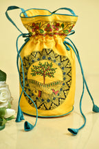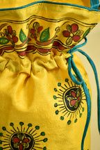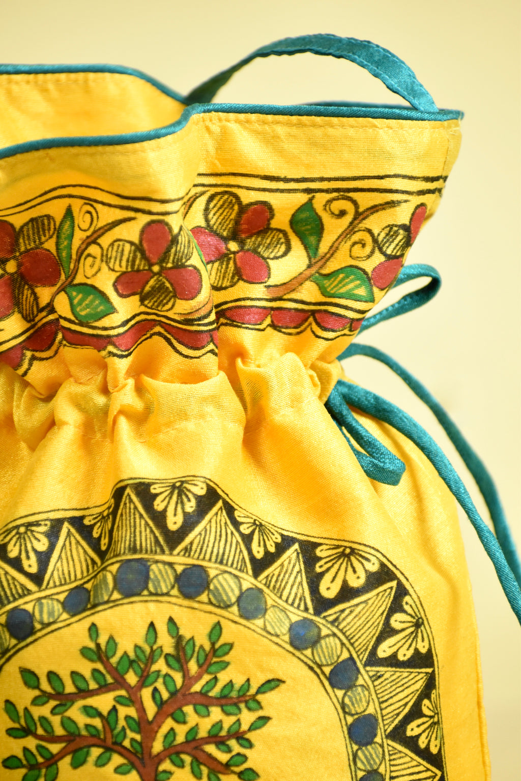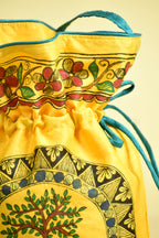 Adorned with beautiful hand-painted multicolor madhubani and contrast piping that add to its charm, our Silk potli is handcrafted, unique and intricate.This ethnic potli is perfect to go along with your traditional or Indo-Western attire.